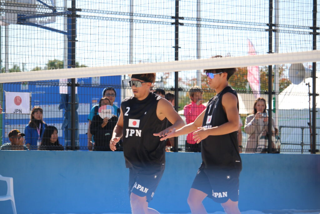 寺井捺貴/山本将隆組は、初戦に2-1で勝利したが、2日目は黒星となり1勝1敗。初戦は「背の高いチームをイメージして練習してきた」(寺井)と準備が実を結んだものの、2戦目は「風に負けてしまい、コンビバレーも有効的に決められなかった」(山本)と反省を口にした。